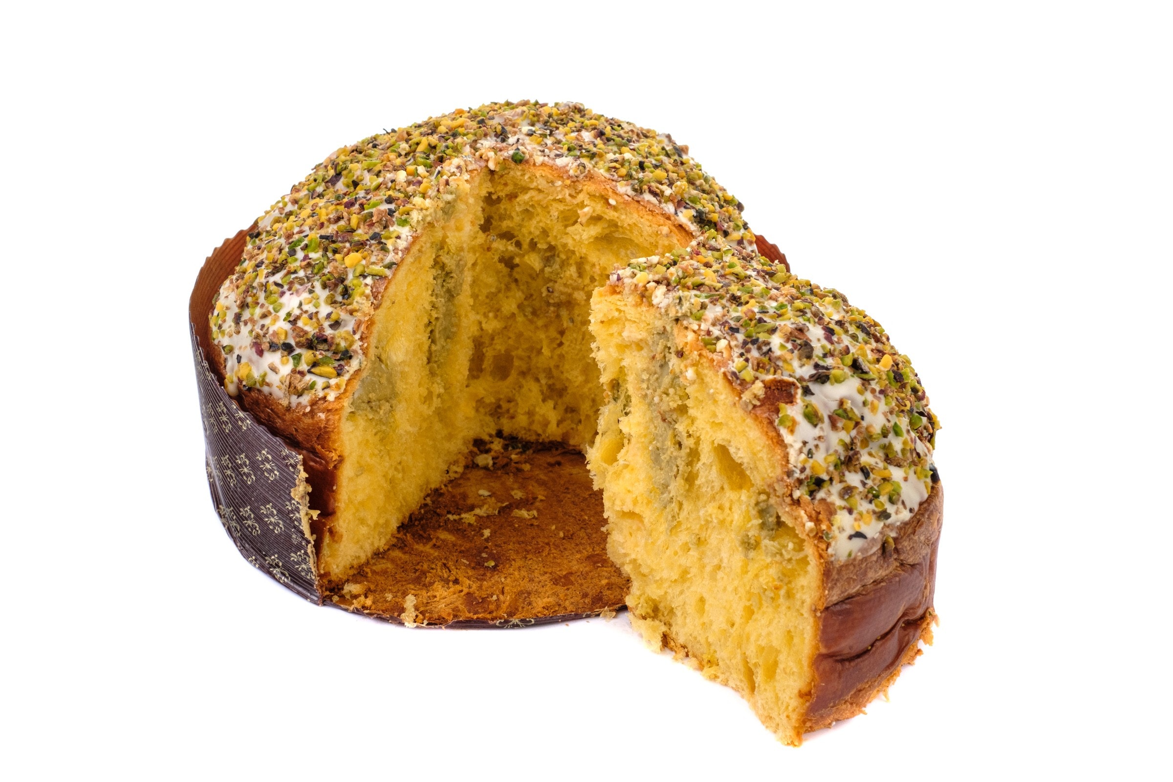Il nostro panettone al pistacchio, farcito con crema al pistacchio e glassato con cioccolato bianco e granella di pistacchio.